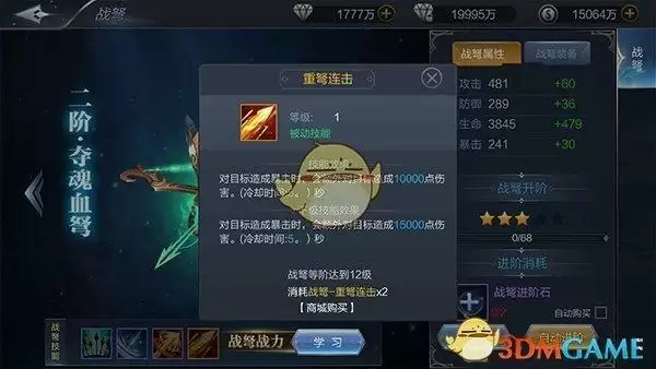 重弩连击:对目标造成暴击时,会额外对目标造成一定伤害(战弩等阶12级,消耗战弩-重弩技能书)