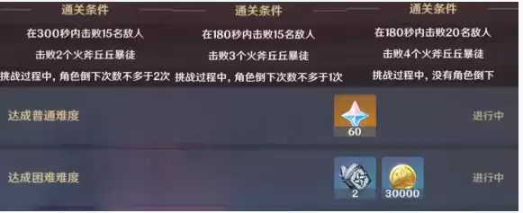 「困难」:需要在210秒内击败20个敌人、击败3个火斧丘丘暴徒,怪物90级;