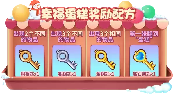 活动期间,在一块隐藏的4x4方格中藏有“西瓜”、“草莓”、“菠萝”和“蛋糕”!每种水果有5份,而蛋糕只有1份!每次花费3000游戏币可参与制作“幸福蛋糕”,从方块中翻开任意三块,并根据所出现的物品获得对应奖励: