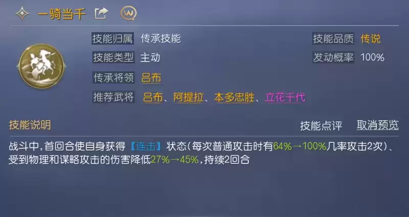 1号技能推荐【一骑当千】,能够使吕布战斗首回合获得【连击】,满级之后每次可以普通攻击2次,这就意味着飞将在第一个回合也能触发2次,大幅度提升了吕布的开局爆发。该技能还可以降低吕布受到的谋略伤害以及物理伤害,减少其兵力损耗。
