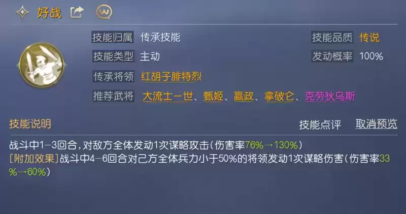 1号技能推荐【好战】,该技能可在前三回合对敌方全体将领发动谋略攻击,配合吕布前三回合的AOE,能够快速压低敌方全体兵力,同时美尼斯作为团队中唯一一个谋略将领,谋略型输出也能完善队伍的输出方式。