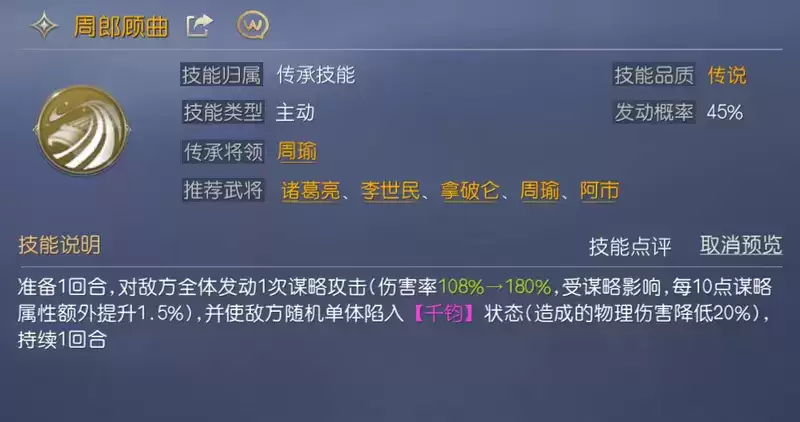 2号技能推荐【周郎顾曲】,该技能是为补充美尼斯在3回合之后是输出空间,提高队伍的AOE技能数量,保证3回合之后也有相当高的输出能力。