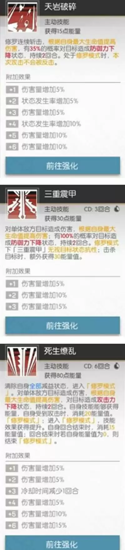 修罗作为较为强力的单体输出,在大部分关卡都可以使用。能量条机制让修罗可以全程保持变身buff,累积下来有很高的收益,因为是额外的buff,和其他的增益buff并不冲突。自身可以给单体上降攻和必中减防buff,让大部分强攻队伍都可以不需要额外带一个给boss上debuff的角色。确定是大招冷却高,没有辅助角色的话降攻buff不能全程挂着。因为堆生命也有不错的伤害收益,因此可以抛弃一部分攻击给修罗堆生命。