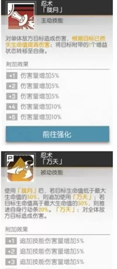 风魔忍技能组看起来很可观,但不实用。对目标已损失的生命值增加伤害实战时并没有很高的加成,相比全体攻击角色伤害不足,比单体攻击角色伤害不够,且伤害加成尴尬。