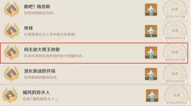而且这个饱食度还可以触发一个成就,玩家们搜集一些普通的果子,然后给角色们吃,将队伍的四个角色的饱食度都吃到满的话,会解锁一个成就:向无敌大胃王致敬,解锁之后能获得十个原石,还没有解锁这个成就的玩家们可以前往完成了,除了这个玩家们在学习食谱和食物熟练度都达到一定的时候,也是能解锁两个成就的,这个可以在平时的日常当中完成,不得不说原神在成就这一方面设计的相当错,也是让玩家们感受到了不少快乐。