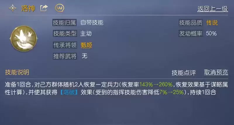 甄姬的自带技能【洛神】有非常可观的恢复率,同时可对目标施加【勘破】,在恢复兵力的基础上降低敌方指挥技能伤害,可保证项羽的兵力健康。