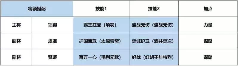 ·够提升主将项羽物理伤害的技能效果,例如力量属性加成、物理伤害强化,使得项羽具有超强的物理输出能力。此外队伍中还配置了一些治疗技能和控制技能,能够稳定项羽的兵力,营造良好的输出环境。