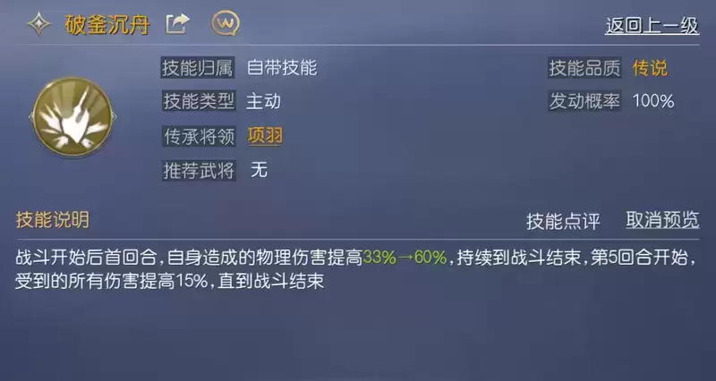 项羽的自带技能【破釜沉舟】能够在首回合起提升自身造成的物理伤害,这是项羽爆发能力的关键,不过此技能的在5回合后会使项羽受到的伤害提高15%,战斗时间过长则对其不利,因此有必要为其搭配提高爆发与续航的队友。