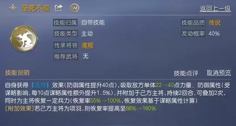 虞姬的自带技能【至死不渝】就是为项羽量身定做,能够偷取敌方力量、防御属性并附加到项羽身上,且能够为项羽提供兵力恢复效果。将项羽作为阵容中的主将,也是因为该技能可进一步提升【至死不渝】对项羽的兵力恢复率。