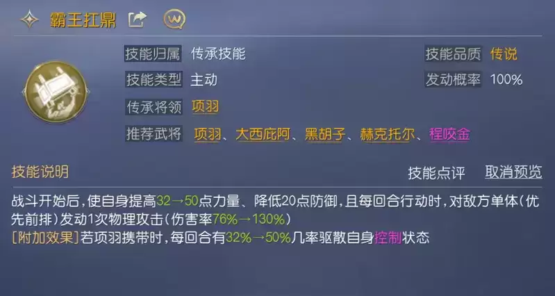 为进一步提升项羽的物理输出能力,第一个技能搭配的是【霸王扛鼎】,该技能可大幅提高项羽的力量属性,并且每回合都有极高概驱散控制,并且还能够使项羽有一定概率驱散自身的控制状态,虽然会降低项羽的防御力,但队伍可提供高额的治疗和援护,不用担心项羽承伤过多。