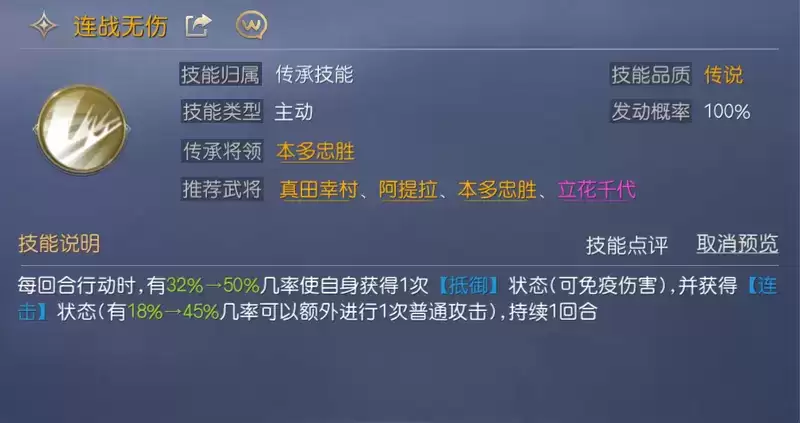 第二个技能推荐【连战无伤】,此技能能够使项羽在每回合概率获得【抵御】状态和【连击】状态,能够提升项羽的承伤能力与普攻次数,配合自带技能的增伤,仅靠普攻也可打出稳定的物理伤害。