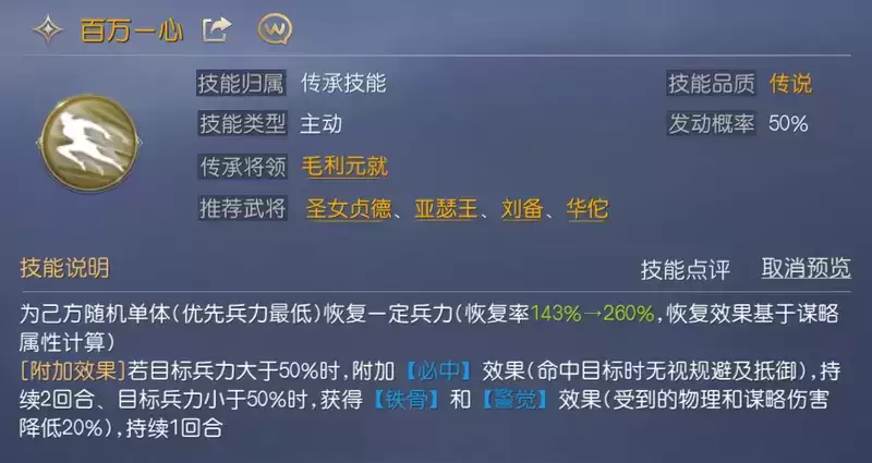 该技能可为兵力最低的将领提供高额兵力恢复,作为前排的项羽必定是承伤最多的存在,该技能可进一步增强项羽的续航,同时会根据项羽兵力的高低为其施加不同的增益效果。