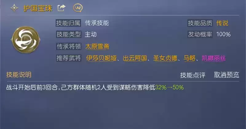 虞姬作为队伍中的纯辅助将领,需要为队伍提供更多的辅助效果,因此两个技能均搭配的是辅助技能。其中,第一个技能搭配的是【护国宝珠】,此技能能够在前3回合大幅降低己方2人受到的谋略伤害。