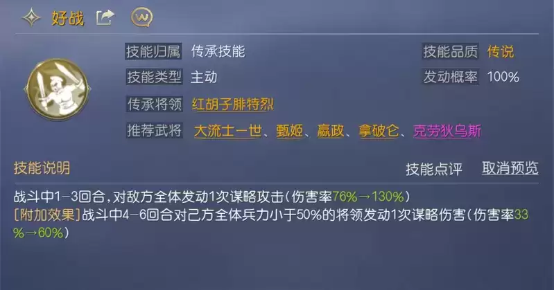 上面说到,甄姬在阵容中定位为副输出兼顾辅助,因此为其搭配的【好战】,该技能可在前三回合造成稳定伤害,能够补充队伍的输出。