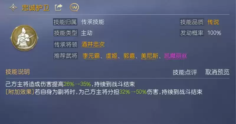 第二个技能搭配的是【忠诚护卫】,该技能可进一步提升项羽的输出能力,同时为其提供援护效果,从而直接提升项羽的输出水平和续航能力。