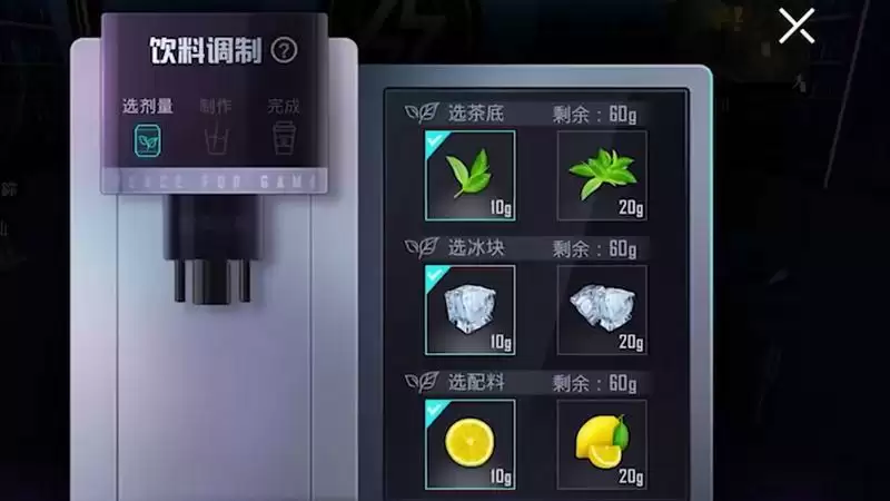 在饮料调制环节,玩家可以选择茶底、冰块以及柠檬的量,在制作完成后,就会随机出现一瓶饮料。