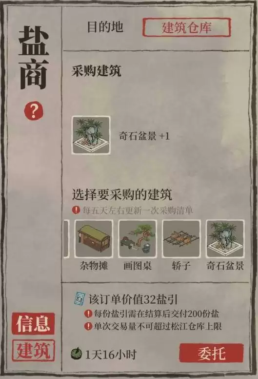 松江盐商如果采购奇石盆景需要32个盐引,也就是6400盐,松江所有仓库升级到极限也到不了6000