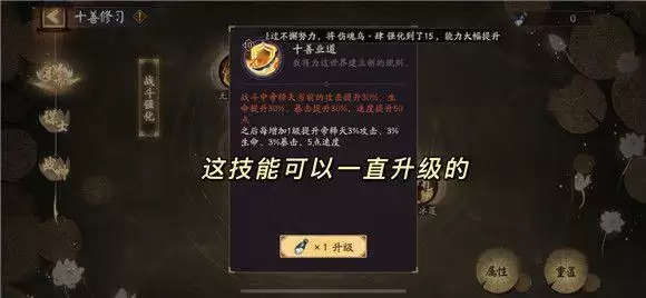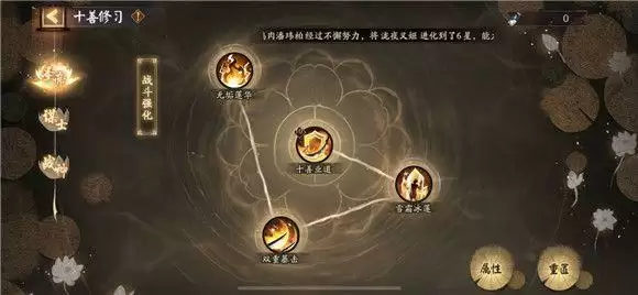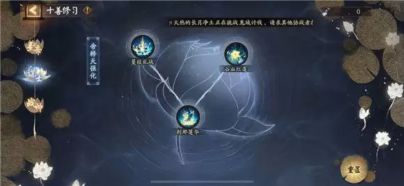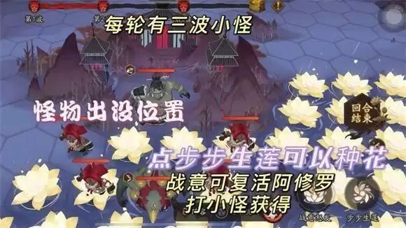 作战界面简单操作说明:左上方为主要怪物出没点,小怪共有三波,我们在第一波阿修罗死掉的时候,先不急着打怪,先在怪物出没点种莲花(点步步生莲,种花有cd,不能种的时候直接点回合结束)等花种的差不多了,回去清掉第一波的小怪获得战意,点击战意怒发,复活阿修罗,坐等小怪踩莲花暴毙就行