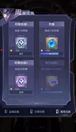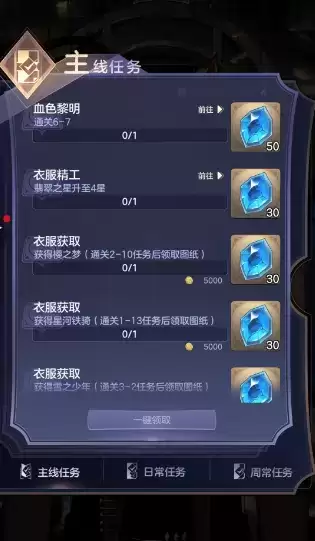 任务:任务主要包括主线任务(通过主线剧情)、合成主线任务送的衣服图纸,日常任务和周常任务(这些也是大部分玩家的抽卡道具的主要来源)