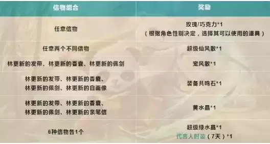 林更新信物包括:"林更新的发带"、"林更新的香囊"、"林更新的佩剑"、"林更新的自画像"、"林更新的亲笔信"、“林更新的宝玉”6种类型。