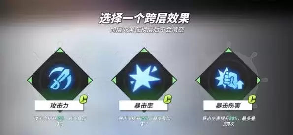 每次挑战之前,可以选择一个跨层效果和本层效果,这些效果可以加强出战伙伴属性,如暴击率、暴击伤害、攻击力、奥义伤害等等。(增益效果分等级,等级越高,增益也越强)
