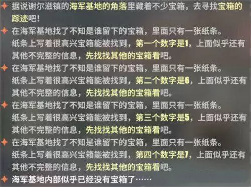 首先就是四个数字线索宝箱如图所示,玩家直接找到,就可以得到一个密码,集齐四个就可以了。