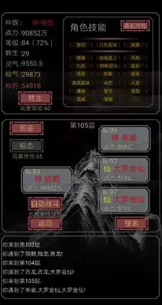 如果是肝帝,前面可以不点自动战斗,一直选人类刷,就可以直接看到『仙 · 大罗金仙』,省去淬炼这一步。这次拟态完之后就不要乱打怪物了,因为大罗金仙是我们要的最终形态,学了没用的技能还要浪费时间去洗,麻烦。