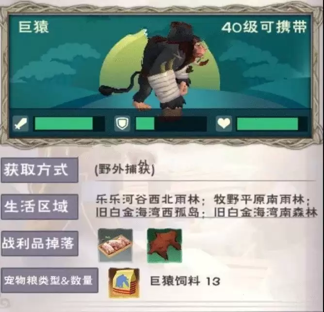 生活区域:乐乐河谷西北雨林、牧野平原南雨林、旧白金海湾西孤岛、旧白金海湾南森林