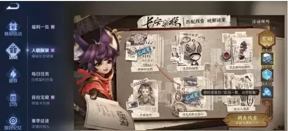 活动设置6个线索,调查线索获得更详细信息,找到与之相匹配的线索并且匹配成功,每当成功匹配第1对、第2对、第3对线索均有奖励(第3对线索奖励为限时语音包-“掐指一算,这把能赢”)