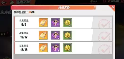 奖励是根据你每一小节战斗的表现来获取星星,集满18个星星之后还有额外奖励冒险笔记,贝里。