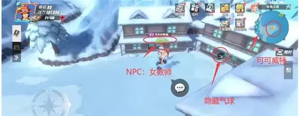 第二个隐藏气球位于“可可威特”最右侧,这里会有一个NPC“女教师”。玩家来到这个位置之后,靠门那个气球就是隐藏气球。20枚金果已到账,请注意查收!