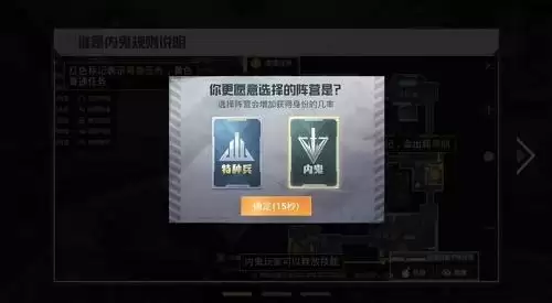 游戏中玩家需要扮演特种兵或内鬼两种身份,玩家主动选择想要的身份倾向,可以增加获得该身份的几率。