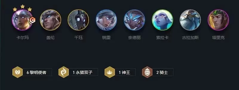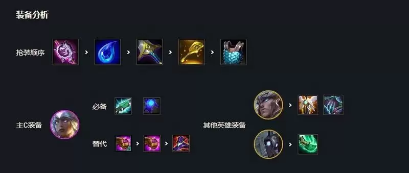 优先卡尔玛装备,蓝BUFF跟科技枪必备,因为有吸血黑暗法爆更好一些,如果没有法爆帽子鬼书之类都可以。主C装备齐了可以做前排装备复活甲传送门都可以,阵容主要是前排顶得住后排就有输出。有回蓝装可以考虑给千珏保卡尔玛不死。