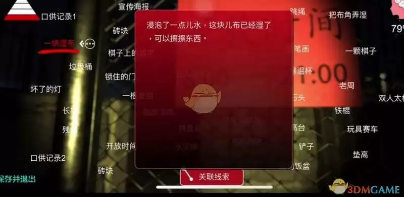 一块湿布:得到线索【把布角弄湿】之后,去【宠物饭盒】位置在点一次获得新线索。