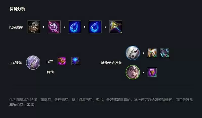开局首抢的装备是手套,先做丽桑卓的法爆蓝霸符,最后无尽。前期不升人口,只留吸血鬼和丽桑卓,不卡利息的话也可以留妖姬,莫甘娜。5人口卡着利息D出三星丽桑卓,就可以锁血上人口。优先丽桑卓的法爆、蓝霸符,最后无尽,莫甘娜复活甲、鬼书,最好都是黑暗的,其次还可以给妖姬做圣杯,而且最好是黑暗的恶意圣杯。