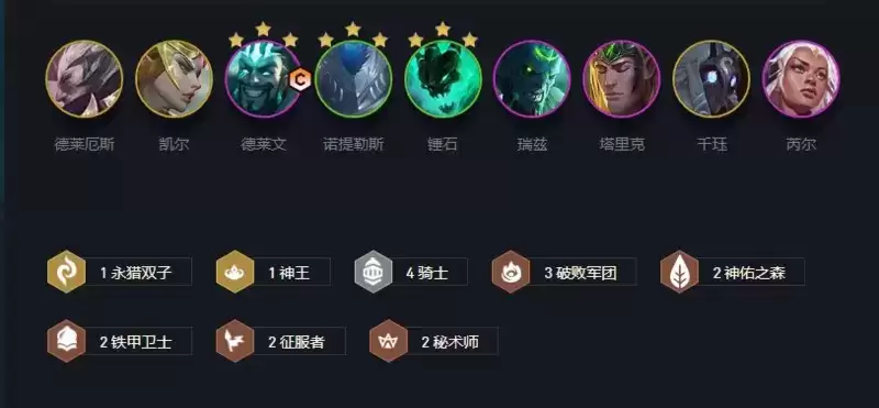前期平稳过渡到七口,这时候看血量如果比较健康我们就可以考虑拉八口D卡,血量太低的话七口小D开出四骑士找到张德莱文便可锁血,正常经济4/4直接拉八口大D一波,我们这时候看来卡情况,如果德莱文D不到来了天使那么我们果断装备给天使照样锁血,当然有饮血剑无尽的话还是比较适合德莱文来C,德莱文中期比较强势后期还是有点乏力,我们稳住血量就要攒钱去拉九口,找高费卡天使搜到二如果决赛物理输出较多我们直接开三铁甲超级肉,法师较多就开四秘术,或者找二星五费卡如大熊一个大控制也是比较厉害的。大后期还是要看站位的,没有暗黑火炮德莱文要靠前一点不然容易逛街,当然没有无尽的情况下我建议做黑暗水银全程免控,神佑的五秒确实有点不够用。