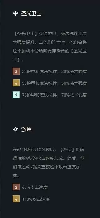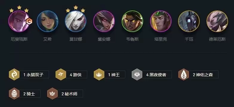 主C厄斐琉斯吃游侠,黑夜、屠龙、神佑之森4个BUFF。输出和生存能力都拉满。阵容整体攻击和防御都俱佳,没有明显天敌,看质量都能打。9圣光的大成天使是劲敌,因为太肉。决赛圈看对手,如果物理输出多,也可以下诺手和皎月,换泰坦和芮尔,组成2铁甲应对。9人口可以上潘森或铁男组成2屠龙。或是贾克斯,就走3铁甲,也可以挂2星天使凑3神佑,看来牌质量都行,灵活变阵。