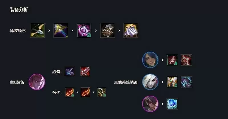 优先主C厄斐琉斯三件套:轻语,饮血必备。不然打不动很肉铁甲前排,第三件黑暗羊刀最好,攻速给的多,有饮血剑可以吸回负面掉血效果。替代是普通羊刀,无尽,火炮也都能用。前排莫甘娜必备:春哥,鬼书。不然开不出技能,减治疗很重要,方便打黎明和各种回血。多余装备可以给寒冰做攻速旗,圣杯,为主C加伤害,电刀,青龙刀也能用。如有黑暗转职成屠龙最佳,这样8人口就可以成型。皎月可带冰心跳后排,宝石和诺手就后期有多的装备就上,偷偷最佳。