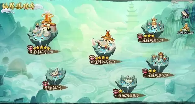 练功房共分为6个房间,分别为:普通练功房、一星练功房、两星练功房、三星练功房、四星练功房、五星练功房