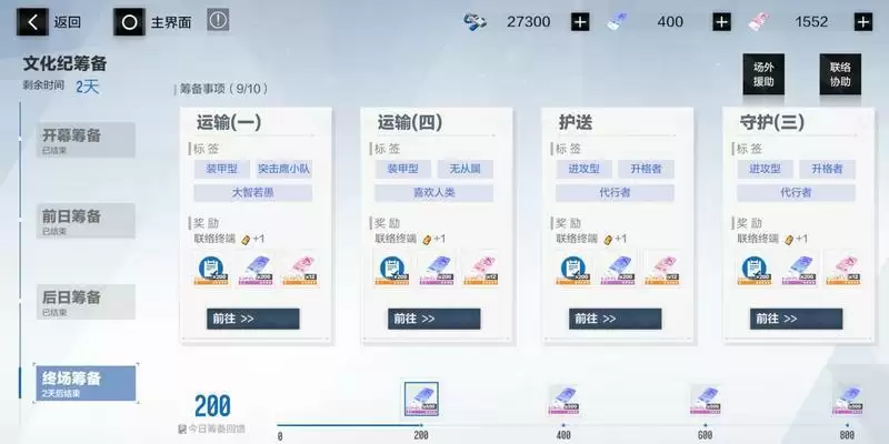 在文化纪筹备的不同阶段里,玩家可派遣的角色也会稍有不同,但要保证派遣的角色与事项的标签相符,如神威就是“装甲型”、“突击鹰小队”和“大智若愚”这三个标签。派遣角色完成相应的事项后,即可获得200纪典印花和12特制印花奖励。