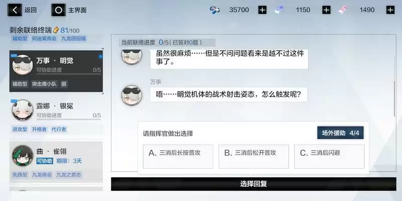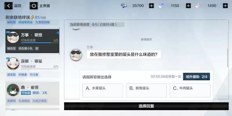 若玩家答错任意问题,则必须再次消耗联络终端来回答问题,通常在玩家答错后角色会自动给出正确答案,因此第二次联络几乎100%成功。当然,若玩家联络终端不足,也可在回答题目时动用场外援助,系统会自动帮助排除错误选项。