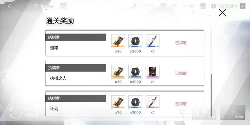 包括剧情关在内,执棋者分为五大关卡,首通每个关卡都能获得30黑卡,共计150黑卡。同时,系统还会奖励大量螺母、武器强化素材和意识突破材料。