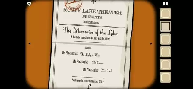 看一下旁边的传单:锈湖记忆一个关于过去和未来的戏剧性故事。野鸡女士分饰三角,蓝衣女士,猫头鹰先生,乌鸦先生。(牛啤啊这个人,有操作的。)同理,记下上面的标志!