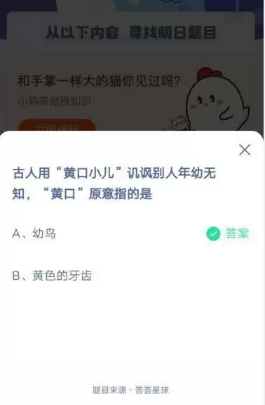 支付宝蚂蚁庄园小课堂2021年5月11日每日一题答案是什么?支付宝蚂蚁庄园小课堂每天的凌晨更新一道题目,答对后能领取小鸡饲料,今天的问题是【古人用“黄口小儿”讥讽别人年幼无知,“黄口”原意指的是】?不知道答案的朋友不妨随三大妈小编一起来看看吧。