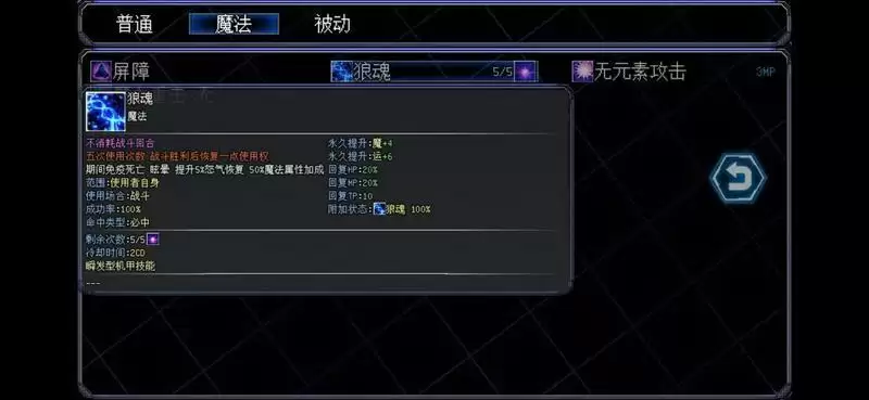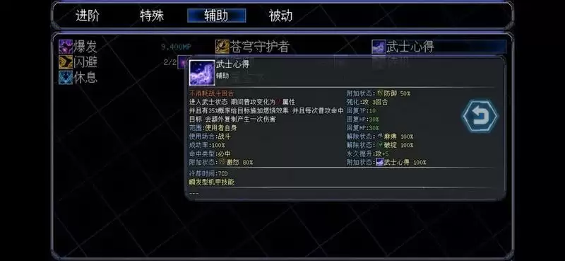 特点:大概率给敌方附加破绽debuff,给自身上免疫物理攻击buff,获得怒气较快,恢复效率较快,开技能永久加5魔法