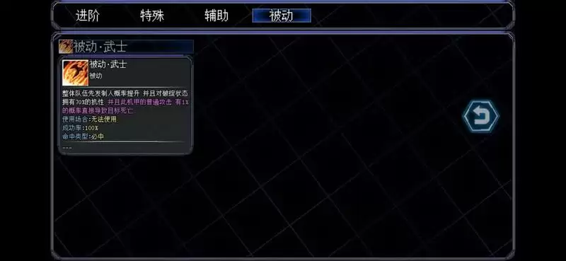 偏防御类型的机甲初始攻击手段偏少,被动所有属性抗性为80%(抗性越低承受伤害越少)
