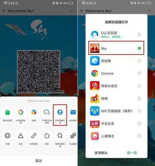 然后让你的好友在微信里面打开,点开右上角的三个小点,需要玩家选择【在浏览器打开】,然后就可以弹出来很多的软件,大家可以选择SKY,也就是使用光遇这个程序来打开,就可以顺利的添加别人为好友。