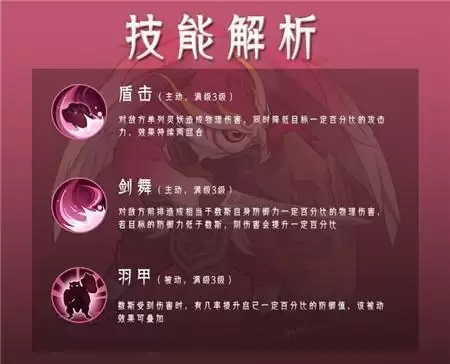 数斯的1技能【盾击】可以对敌方单列两名灵妖造成物理伤害,同时可以使目标的攻击力降低;2技能【剑舞】是对敌方前排3名灵妖造成相当于数斯防御力一定百分比的物理伤害,如果攻击的目标防御力低于数斯,则造成的伤害更高,被动技能【羽甲】则是在数斯受到伤害之后,防御力会得到永久提升。在对战中,数斯的防御力可以叠加得越来越高,是一名防御能力十分强大的灵妖。