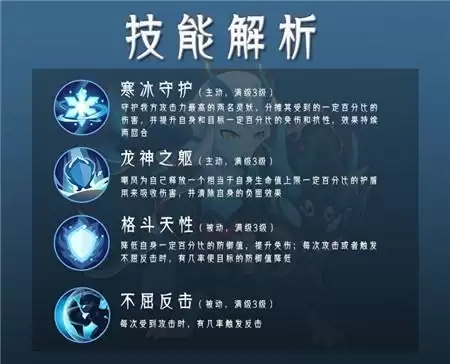 嘲风是来自四海的一名御者,有着十分强劲的保护能力,他的1技能【寒冰守护】可以为我方攻击力最高的两名灵妖分担一定量的伤害,并且增加他们的抗性,降低受到控制的几率;2技能【龙神之躯】可以给他自身提供一个护盾,并且清除身上的负面状态;被动技能【格斗天性】是将嘲风自身的防御值转化为免伤,并且不管嘲风主动攻击敌人还是被攻击时触发了反击,都有机会降低目标的防御值。