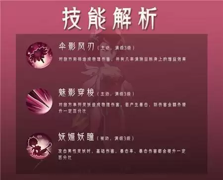 胜遇的技能机制比较特殊,她的1技能【伞影风刃】可以随机驱散目标身上的一个增益效果,这对于一些需要特定加成效果的灵妖来说针对性比较强;2技能【魅影穿梭】在暴击时,可以额外增加额外的伤害;另外因为自己不幸的遭遇,胜遇对男性灵妖的产生了无法化解的憎恨,被动技能【妩媚妖瞳】可以提高她对男性灵妖的基础伤害,暴击率和暴击伤害。